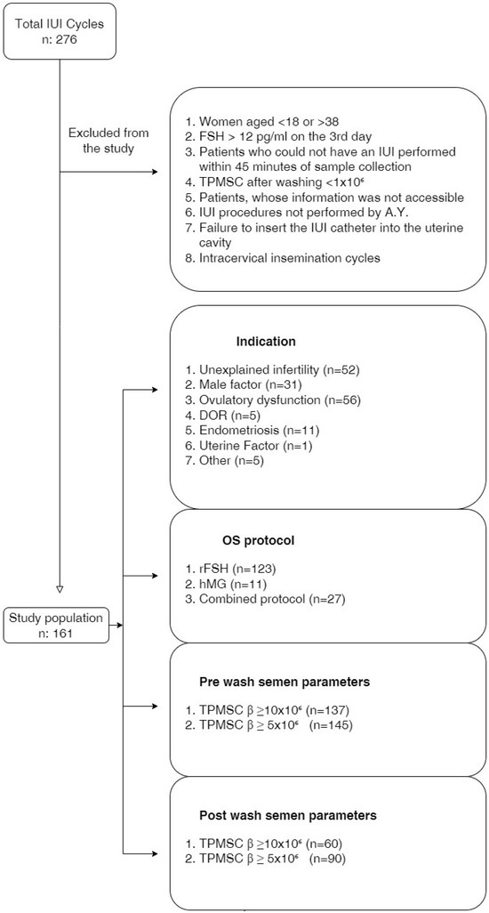 Ovulation induction (OI) was started in patients with endometrial thickness < 4 mm and without follicles > 10 mm by performing a vaginal ultrasonographic examination on the 2nd or 3rd day of the cycle. OI was conducted using one of three randomly selected regimens. Combined protocol: after 5 mg/day of oral letrozole for 5 days, 75 IU parenteral human menopausal gonadotropin (HMG) or recombinant FSH (rec-FSH) was administered on the 6th and 7th days of induction. In the other two protocols, on the 2nd or 3rd day of the menstrual cycle, rec-FSH or HMG 75 units were given for 7 days. Patients were called for control on the 8th day after 7 days of OI. When the transvaginal measured dominant follicle reached ~18 mm in size, ovulation was triggered with the parenteral HCG injection. A total of 34–36 h after triggering ovulation with hCG, IUI was applied with the sperm sample that was washed in the andrology laboratory. After OI, patients in whom no dominant follicle was detected in the control were called for another visit after 3 days of increasing the amount of parenteral gonadotropin by 50%. The cycle was canceled for patients who had no follicle development at the end of 21 days of induction. Additionally, the IUI procedure was canceled in patients with ≥3 follicles with a diameter of 16 mm. Patients who could not have an IUI performed within 45 min of sample collection, TPMSC after washing <1 × 106, patients with a low ovarian reserve, patients whose information was not accessible, IUI procedures not performed by A.Y., failure to insert the IUI catheter into the uterine cavity, or intracervical insemination cycles were also excluded. Included and excluded patients are summarized in the study flowchart (Figure 1).