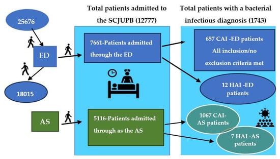 The following exclusion criteria have been used: patients with a negative microbiological result (C1), colonized, not infected patients (C2), patients diagnosed with an infection after 3 days of hospitalization and those who presented in the ED with an infection but have been discharged for a maximum of 48 h from another hospital or are within 30 days postoperatively (90 days in case of implant) (C3), patients who come from chronic care or elderly care units (C4); 21 ED patients were excluded from the study based on these exclusion criteria (4-C1, 5-C2, 10-C3, 2-C4). Figure 1 presents the study flow diagram.