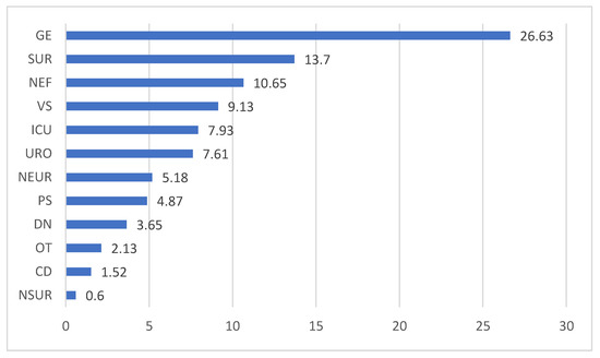 Breakdown by ward of CAI admitted through the ED (%). Legend: GE—Gastroenterology, SUR—Surgery, NEF—Nephrology, VS—Vascular Surgery, ICU—Intensive Care Unit, URO—Urology, NEUR—Neurology, PS—Plastic Surgery, DN—Diabetes and Nutrition, OT—Orthopedics-Traumatology, CD—Cardiology, NSUR—Neurosurgery.