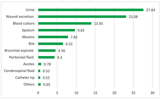Regarding the study of ED-CAI infections, from 657 ED-CAI patients, 767 clinical samples were collected for bacteriological diagnosis. The most numerous were urine cultures, wound drainage, and blood cultures (27.64%, 23.08%, 13.95%). Internal fluids together account for a significant percentage of 11.60% (Figure 3).