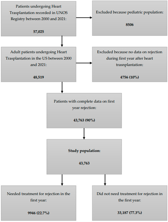 According to the UNOS Registry, a total of 57,025 patients underwent isolated heart transplantation in the United States between 2000 and 2021, and 8506 pediatric patients were excluded. Of 48,519 adult patients who underwent heart transplantation, complete data on first year rejection were available for 43,763 (90%) of them, which were included in our analysis and represent the study population. Of this, 9946 (22.7%) had at least one episode of rejection that needed treatment in the first year after transplantation (Figure 1).