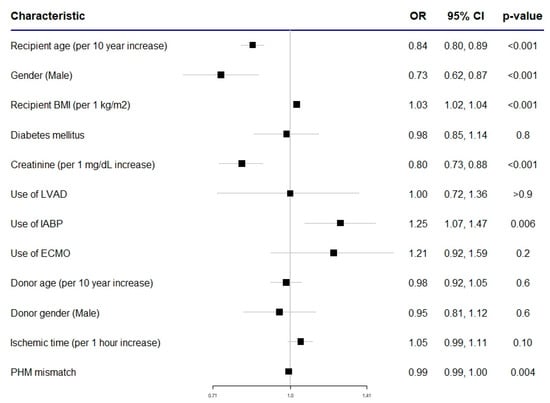 Forest plot representing ORs (odds ratios) for mortality of patients undergoing heart transplantation in the new allocation era. 95% CI: 95% confidence interval. BMI: body mass index. ECMO: extracorporeal membrane oxygenation. IABP: intra-aortic balloon pump. LVAD: left ventricular assist device. PMH: predicted heart mass.