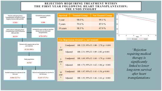 Our study highlighted that instances of rejection requiring medical therapy are significantly linked to lower long-term survival after heart transplantation. Risk factors for early rejection should be defined and considered when making transplantation decisions and providing ongoing patient care. Further studies with better granularity of data are needed (Figure 4).