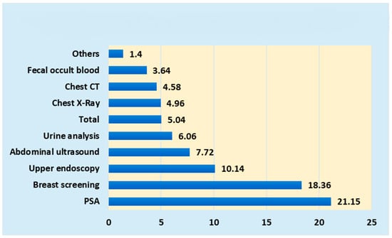 The cancer detection rates were 21.15% for PSA assessment, 18.36% for breast screening, 10.14% for gastric endoscopy, and 7.72% for abdominal ultrasonography, with an overall average rate of 5.04%.