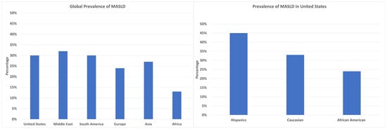 MASLD has emerged as the most prevalent chronic liver disease worldwide in the last 20 years, affecting an estimated 25% of the global population [,]. A meta-analysis by Liu et al. estimated the global prevalence of MASLD in overweight/obese adults to be approximately 50.7% (95% CI [46.9% to 54.4%]) []. Current estimates show that MASLD affects 30% of the United States (US) population, 32% of the Middle Eastern population, 30% of the South American population, 27% of Asian populations (highest in East Asians), 24% of the European population, and 13% of the African population (Figure 1) [,]. In the US, Hispanic Americans (45%) have a higher prevalence of MASLD than Caucasians (33%), while African Americans (24%) have the lowest prevalence among all racial and ethnic groups (Figure 1) []. Furthermore, among the Hispanic population, those of Mexican heritage have the highest prevalence, while Dominican Republicans have the lowest prevalence [,]. In the US, men are disproportionately affected, making up to 58% of total MASLD cases []. At the same time, postmenopausal women display an increased risk of severe fibrosis compared to men, which can probably partially be attributed to the loss of the protective effects of estrogen against fibrogenesis []. However, why the loss of a protective factor results in a more accelerated deterioration in men remains to be elucidated. One potential explanation may be the lower muscle mass at similar BMIs.