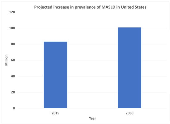 In the United States, the population affected by MASLD is anticipated to increase from 83.1 million in 2015 (approximately 25% of the population) to 100.9 million by 2030 [], which is more than 1 in 4 Americans (Figure 2). This scale also indicates that non-pharmacological interventions will be important, as it is not sustainable to treat all patients pharmacologically, specifically at current prices.