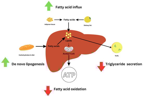 In MASLD, there is an increase in the release of triglyceride-enriched lipoproteins from the liver; however, there is much higher fat buildup within hepatocytes. Patients with steatohepatitis, in particular, experience reduced synthesis and export of lipoproteins, implying a limited ability to remove VLDL particles, possibly due to hepatocyte impairment []. Additionally, patients with MASLD produce increased small, dense LDL particles, which are associated with an increased risk of cardiovascular disease.