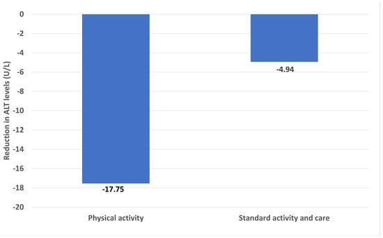 Current literature reinforces the individual merits of aerobic exercise and diet in diminishing alanine aminotransferase (ALT) levels. One study showed that exercise significantly reduced ALT levels compared to standard physical activity and standard care (−17.55 U/L and −4.94 U/L, respectively) (Figure 5) []. Yet, integrating diet and exercise was markedly more effective in decreasing ALT levels (MD, −9.63 IU/L) than exercise alone (MD, −7.59 IU/L) []. A subsequent meta-analysis affirmed that a combination of diet and exercise significantly lowered ALT (mean decrease of 14.15 U/L) and AST (mean decrease of 7.33 U/L) relative to the control group [].