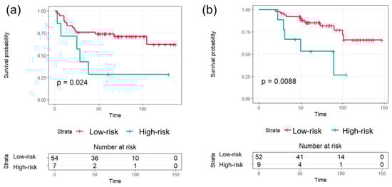 Rad-score was significantly associated with both PFS and OS. In predicting PFS, the 3- and 5-year PFS of the low-risk group (76% and 74%, respectively) were higher than those of the high-risk group (43% and 29%, respectively, p = 0.024, Figure 1a). In predicting OS, the 3- and 5-year OS of the low-risk group (92% and 85%, respectively) were significantly higher than those of the high-risk group (67% and 53%, respectively, p = 0.009, Figure 1b).