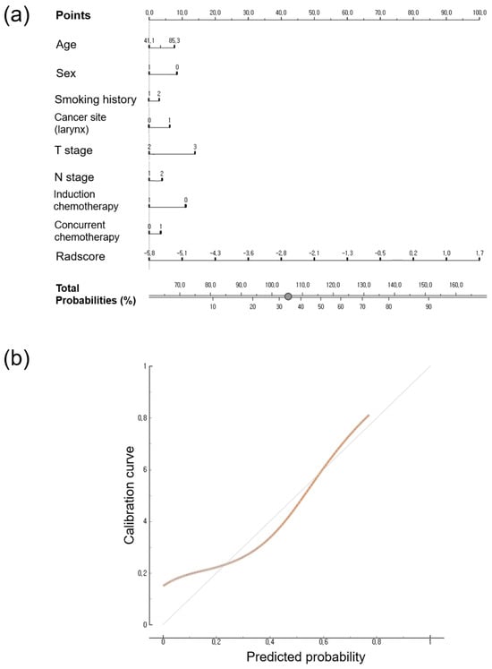 The association between clinical characteristics and a risk-stratified group of radiomics according to the PFS and OS prediction models was investigated (Supplementary Tables S2 and S3). In the PFS prediction model, there were no differences in the clinical parameters between the low-risk and high-risk groups. In the PFS prediction model, only the number of those in the progression group (p = 0.030) were significantly different between the low-risk and high-risk groups. In the OS prediction model, there were significant differences in T stage (p = 0.042) and the number of deaths (p = 0.032) between the low-risk and high-risk groups. Otherwise, there was no significant difference between low-risk and high-risk groups in age, sex, smoking history, cancer site, concurrent chemoradiotherapy, induction chemotherapy, and N stage.