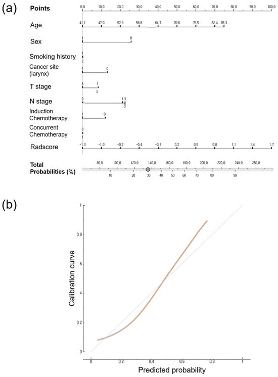 (a) Nomogram to predict the risk of 3-year overall survival. (b) Calibration curve depicted according to agreement between predicted and observed 3-year outcomes. The 45-degree diagonal line represents ideal calibration, where the predicted probabilities perfectly match the observed outcomes. The brown line represents the actual prediction of 3-year outcomes.