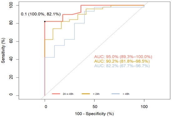 At the end of the study, patients were divided into groups based on their NIHSS score on day 9 (0–8 “good” and >8 “poor”), the delta NIHSS (“no improvement” ≤0 and >0 “improvement”), and the MRS (“good” 0–2 and >2 “poor”). The ROC curve analysis revealed that the cut-off value of S100B in each sampling point was 0.100 μg/L. For the ROC curve to determine the sensitivity and specificity of S100B at different time points, predicting the outcome measured as “good” (NIHSS 0–8) and “poor” (NIHSS > 8), the AUC was 95.0% (89.3–100.0%) for time point 24–48 h (sensitivity 82.1, specificity 100.0%). For other sampling points, the AUC was 90.2% (<24 h) and 82.2% (>48 h), respectively (Figure 1).