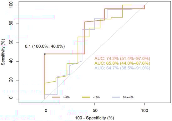 For the ROC curve to determine the sensitivity and specificity of S100B at different time points predicting the short-term outcome measured as “no improvement” (delta NIHSS ≤ 0) and “improvement” (delta NIHSS > 0), the AUC was 74.2% (51.4–97.0%) for time point >48 h (sensitivity 48.0, specificity 100.0%). For other sampling points, the AUC was 65.8% (<24 h) and 64.7% (24–48 h), respectively (Figure 2).