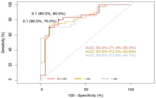 For the ROC curve to determine the sensitivity and specificity of S100B at different time points, predicting the long-term outcome measured as “good” (MRS 0–2) and “poor” (MRS ≥ 3), the AUC was 83.4% (71.3–95.5%) for time point 24–48 h (sensitivity 80.0%, specificity 80.0%). For other sampling points, the AUC was 83.5% (73.3–93.8%) (<24 h) (sensitivity 80.0%, specificity 80.0%) and 84.0% (73.8–94.1%) (24–48 h), respectively (Figure 3).