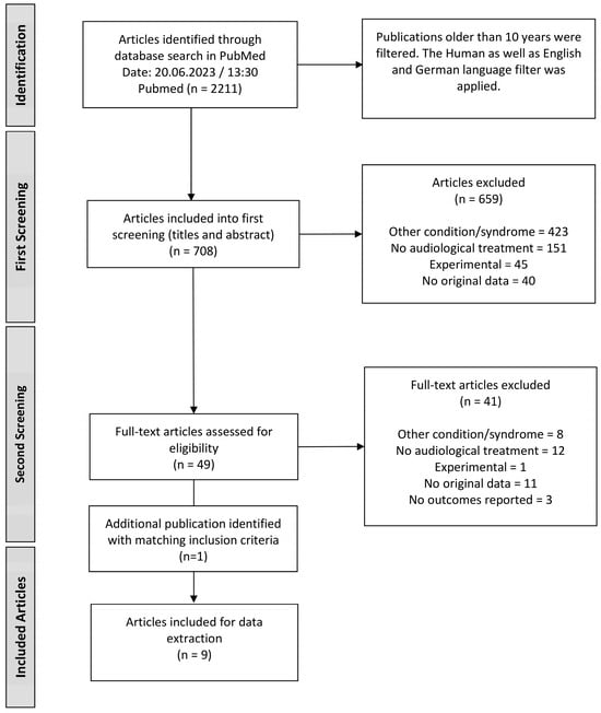 The screening process is described graphically in Figure 1. In the first stage of screening, the titles and abstracts were considered, and 659 publications were excluded using the criteria in Table 2. As shown in Figure 1, most of the literature had to be rejected because it dealt with other conditions, such as Goldenhar syndrome or Nager syndrome. In the second screening phase, the complete articles were examined, and 41 of the 49 publications had to be excluded. This left a total of eight publications that were eligible for data extraction. In the process of the literature search, an additional paper [] was found that met the criteria, as it deals with Treacher Collins patients, describes audiological rehabilitation, and was also published in the last 10 years. Unfortunately, this publication was not included in the original search for unknown reasons but was added for the data collection of this systematic review due to the matching inclusion criteria. For this reason, data were collected from a total of nine publications.