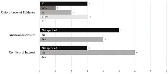 The publications mostly provided only a small number of study participants, which was noted in Table 3. Sometimes, only individual cases were presented. This is one of the reasons why the publications were not rated so well in the Oxford Level of Evidence evaluation. Due to the small and sometimes mixed study cohorts, as well as the small number of follow-up data acquisitions, the meaningfulness of the publications is sometimes not that high. Of the nine studies extracted, three publications were classified for the lowest level, which can also be seen in Figure 2. The highest level reached by three studies was the intermediate level III-IV. Additionally, four of the nine publications examined were financially supported, which can be seen in Figure 2. Most of the support came from scientific foundations or national research programs. Thus, no company was involved in the financial support. As shown in Figure 2, six publications made it clear that there was no conflict of interest. In the remaining studies, it was not stated whether a conflict of interest existed.