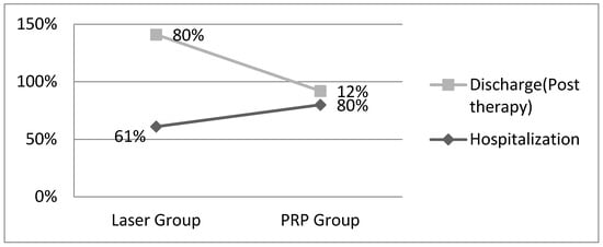 The underlying pathologies sometimes impact the mobility of patients. The mobility scale used in this study ranges from 0 to 5, with 5 indicating an inability to walk with the affected limb, and 0 indicating that walking is not affected. When comparing the evolution of the mobility scale between the two groups, it became evident that the laser therapy group showed a quicker improvement in symptoms compared to the PRP group. Upon examining the values of the mobility scale on the day of discharge, we can observe a decrease in values in both groups. However, this decline was more rapid in the laser therapy group, and it continued until the day of discharge. This clinical observation is consistent with the faster improvement in symptoms seen in the laser therapy group, as outlined in Table 2.