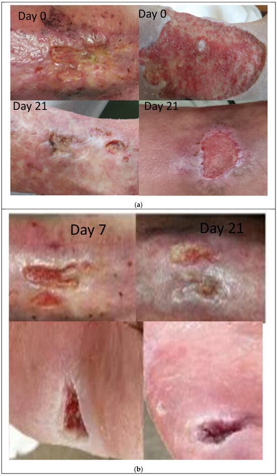 An essential prerequisite for effective wound healing is the prevention or elimination of clinically significant wound infections. It is important to recognize that nearly every chronic wound is contaminated or colonized with microorganisms, typically without causing clinical issues. Therefore, diagnosing a wound infection from a clinical perspective should rely on identifying local signs of inflammation []. In cases where systemic infection is suspected, a complete blood count should be conducted, and additional diagnostic criteria include the presence of fever and chills. Systemic antibiotic therapy should generally be reserved for situations involving septic conditions or generalized sepsis, with only a few exceptions.