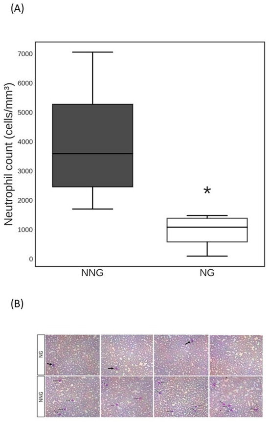 (A) Boxplot of neutrophil count values per group. Interquartile ranges from the 25th to 75th comprise the box body. The black horizontal line presents the median in the center of the box. The boxes’ whiskers show the distribution. (B) Representative image of normal and neutropenic blood smear. Black arrows indicate the neutrophil. * p < 0.05 vs. NNG.