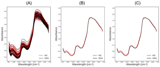 The averaged raw NIR spectra of each group are depicted in Figure 2A. The red line represents the NG and the black line represents the NNG. Figure 2B shows the average spectra per group after pre-processing.