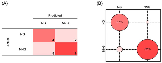 (A) Confusion matrix of SVM predictions on the test set. (B) Confusion ball representation of sensitivity (67%) and negative predictive value (82%). All data refer to the test set predictions.
