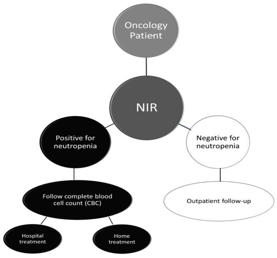 Due to the high negative predictive value of the solution tool proposed in this paper, a framework suggested by the authors states that oncology patients are initially screened with NIR spectroscopy. A negative NIR result displays elevated confidence to assure outpatient follow-up, as illustrated in Figure 5. Otherwise, if the NIR screening test is positive, the patient should undergo a complete blood count to determine in-hospital or out-of-hospital care. In this context, our study presents a potentially effective and robust methodology for predicting neutropenic patients faster than the gold standard method (CBC), without being invasive and with lower overall costs than traditional blood count tests, which can guide healthcare in chemotherapy decision making.