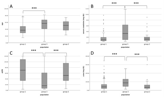 Comparison of the study population split into three groups. (A): age; (B): serum creatinine; (C): eGFR; (D): blood urea levels. Group 1: kidney histological correlated to IRD known at the time of biopsy. Group 2: kidney histological findings not correlated to IRD known at the time of biopsy. Group 3: “de novo” IRD not present in medical history at the time of biopsy. *** p < 0.001. IRD: immuno-rheumatological disease. eGFR: estimated glomerular filtration rate. circles and asterisks are outliers.