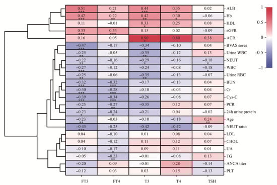 Heat map clustering of correlation coefficients between thyroid hormone and laboratory test in AAV patients with renal injury; * p < 0.05, ** p < 0.01, *** p < 0.001.