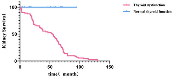 In this cohort of 174 individuals, 151 patients (86.78%) were fully followed up. Briefly, 23 patients (13.21%) of the study were lost to the follow-up. Among the 151 patients included in the survival analysis, 23 patients had normal thyroid function and 128 patients had thyroid dysfunction. The median follow-up time was 68.6(64.3, 72.8) months. Kaplan–Meier survival analysis showed that the thyroid dysfunction group and normal thyroid function group in AAV patients with renal injury predicted significantly different survival curves. Furthermore, the AAV patients with thyroid dysfunction tended to have a worse kidney prognosis (p = 0.004, Figure 2). Among the 128 AAV patients with thyroid dysfunction, 78 patients reached the endpoint of dialysis dependence, while among the 23 AAV patients with normal thyroid function, 3 patients reached the endpoint of dialysis dependence. Univariate Cox regression analysis showed that thyroid dysfunction was a risk factor for AAV patients with renal injury to progress to the endpoint of dialysis dependence (HR: 3.921, 95%CI: 1.434–10.722, p = 0.008). Multivariate Cox regression analysis showed that thyroid dysfunction was also significantly associated with the risk of progression to dialysis dependence (HR: 4.051, 95%CI: 1.466–11.194, p = 0.007).