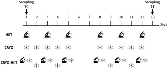 Training sessions took place at the same time of day (in the morning, between 8:30 a.m. and 9:00 a.m., after a light breakfast). Blood was collected by a skilled nurse, through standard venipuncture, after overnight fasting, on a 10 min resting subject in a sitting position between 8:00 a.m. and 10:00 a.m. T0 was collected in fasting subjects at the beginning of the intervention (day 1, prior to HIIT and/or cryotherapy). T1 was collected in overnight fasting subjects 24 h after the last intervention.