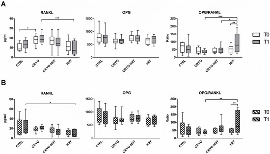 Regarding the osteo-immune compartment, circulating levels of RANKL were significantly upregulated after CRYO treatment at T1 compared to HIIT groups. Curiously, CRYO showed an increase in RANKL circulating levels also at baseline. No within-group differences were observed between T0 and T1. Circulating OPG was unchanged, but the OPG/RANKL was reduced in CRYO and CRYO-HIIT at T1 compared to HIIT and was strongly increased in HIIT group (T0 vs. T1) (Figure 3A). Considering only the obese cohort, RANKL and OPG/RANKL showed no between-group differences at T0, but while RANKL was reduced in HIIT compared to CTRL, OPG/RANKL was increased in HIIT compared to CRYO, at T1 (Figure 3B). Additionally, OPG/RANKL increased in the HIIT group (T1 vs. T0), similarly to the whole population.