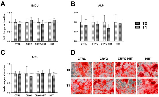 The potential effects of HIIT, alone or in combination with WBC, were investigated on differentiated osteoblasts. To this aim, osteoblastic differentiation was induced in SaOS-2 cells during treatments with 20% of subjects’ sera, for 7 or 10 days. Different interventions did not influence cell proliferation and neither had any effect on ALP activity (7 days) or on the deposition of calcified matrix after 10 days (Figure 5).