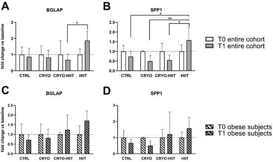 Expression of genes related to osteoblast functions were analyzed also during osteoblastic differentiation. After 7 days of treatments with sera, the expression of RUNX2, MYC, ALPL, COL1A1, and AXIN2 was not modulated in differentiated osteoblasts (Supplemental Figure S2). SPP1 expression was reduced in CRYO and CRYO-HIIT at T1 compared to T0, even though not significantly. However, post-intervention, SPP1 was strongly upregulated in HIIT compared to all the other groups (Figure 6). Similarly, BGLAP was slightly but not significantly reduced in CRYO and CRYO-HIIT, while significantly upregulated in HIIT compared to CRYO-HIIT at T1. All the significances observed were lost when only the obese cohort was considered (Figure 6 and Supplemental Figure S2).