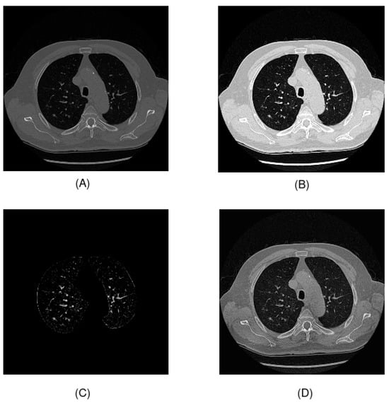 Regarding preprocessing, numerous techniques are available for working with CT scans. In this study, we used the two preprocessing techniques for Hounsfield units and contrast enhancement proposed in the original article by Chaudhry et al. [24] and two proposed techniques based on lung segmentation and thresholding and on contrast-limited adaptive histogram equalization (CLAHE) for contrast enhancement. The application of these four techniques on a CT image is shown in Figure 2: