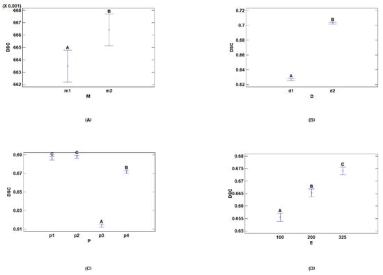 Means and 95.0 percent LSD intervals for DSC: (A) means and intervals for dataset; (B) means and intervals for model; (C) means and intervals for preprocessing; (D) means and intervals for epochs.