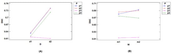 Figure 4B shows the interaction plot between the preprocessing techniques and the models. We can see that, once again, the p1 and p2 techniques achieved better results. Additionally, p1 and p2 showed an increase in DSC when moving from the baseline model (m1) to the residual model (m2). These results demonstrate that both preprocessing methods improved performance in terms of DSC when used with m2. In the case of p3, there was hardly any change when transitioning from one model to another. Finally, when using the CLAHE technique (p4) the results decreased as we switched from one model to another.