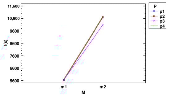 Figure 6 shows the interaction plot that illustrates how the two deep learning models performed relative to execution time when applying different types of preprocessing methods. The interaction plot reveals that the execution times associated with preprocessing methods p1, p2, and p4 are nearly indistinguishable across models U-Net (m1) and residual U-Net (m2), as evidenced by their nearly overlapping lines. This indicates that selecting these preprocessing methods had a minimal impact on model performance, in terms of execution time. However, p3 displays a notable deviation from this pattern, showing a distinct interaction with the models, where the change in execution time from m1 to m2 differed. In addition, p3 was faster than the other preprocessing methods in the m2 model.