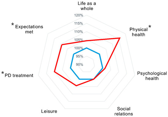 Satisfaction with Life and Treatment Scale-7 (SLTS-7) at preoperative baseline and 6-month follow-up. Abbreviations: PD = Parkinson’s Disease and SLTS-7 = Satisfaction with Life and Treatment Scale. SLTS-7 item scores are normalized to baseline scores per subject. Blue: baseline, red: 6-month follow-up. The larger area of the red relative to the blue reflects an SLTS-7 item improvement. *: significant changes from baseline to 6-month follow-up.
