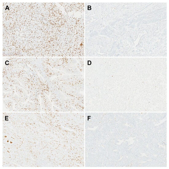 Representative immunohistochemistry of CD11b+ tumor-infiltrating myeloid cells (TIMs), CD8+ tumor-infiltrating lymphocytes (TILs), and CD163+ tumor-associated macrophages (TAMs). (A) High CD11b+ TIM level. (B) Low CD11b+ TIM level. (C) High CD8+ TIL level. (D) Low CD8+ TIL level. (E) High CD163+ TAM level. (F) Low CD163+ TAM level.