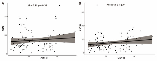 The correlation of the mean number of CD8+ tumor-infiltrating lymphocytes (TILs) and CD163+ tumor-associated macrophages (TAMs) according to those of CD11b+ tumor-infiltrating myeloid cells (TIMs) in distal bile duct cancer. The correlation is not identified significantly in CD8+ TILs (R = 0.11, p = 0.31) (A) and CD163+ TAMs (R = 0.17, p = 0.11) (B) with those of CD11b+ TIMs, respectively.