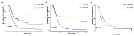 The median OS was 22.25 months. The patients with either low levels of CD11b+ TIMs or high levels of CD8+ TILs had longer OS compared to those with high levels of CD11b+ TIMs or low levels of CD8+ TILs (low CD11b+, p < 0.001; high CD8+, p = 0.003). Conversely, CD163+ TAM status was not significantly related to OS (p = 0.18) (Figure 3A–C).