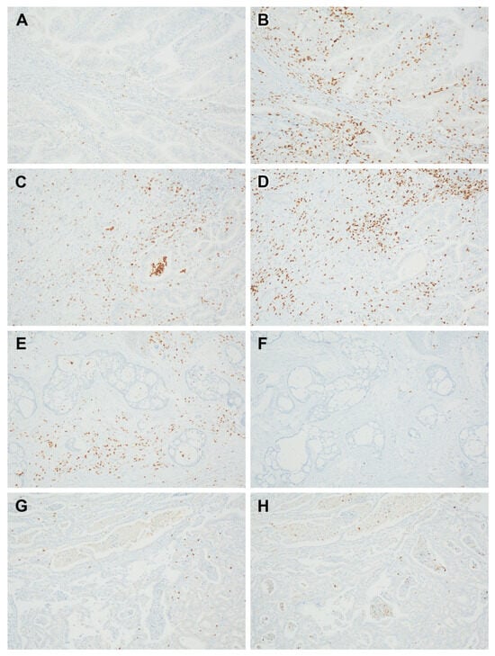 Concomitant low levels of CD11b+ TIMs and high levels of CD+8 TILs were found in 27 patients (30.0%) (Figure 4A–H). The tumors with low levels of CD11b+ TIMs and high levels of CD8+ TILs were significantly associated with a low T stage (p < 0.001) (Table 2).