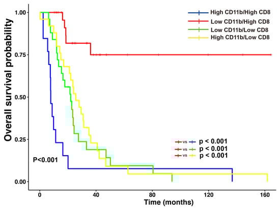 According to the status of combined CD11b+ TIMs and CD8+ TILs, patients had significantly increased OS (p < 0.001). In detail, the patients with combined low CD11b+ TIMs and high CD8+ TILs had longer OS than the patients with the following combinations: combined high CD11b+ TIMs and high CD8+ TILs (p < 0.001); combined low CD11b+ TIMs and low CD8+ TILs (p < 0.001); or combined high CD11b+ TIMs and low CD8+ TILs (p < 0.001) (Figure 5).