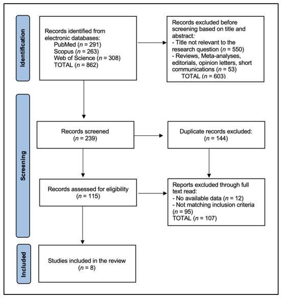 The initial search identified 862 articles. After removing 144 duplicate entries, 603 records were excluded based on their titles and abstracts before screening. Following a full review, 95 articles were excluded for not meeting the inclusion criteria or lacking available data. Ultimately, the systematic review included 8 eligible studies in the final analysis, as shown in Figure 1 and Table 1 [21,22,23,24,25,26,27,28].