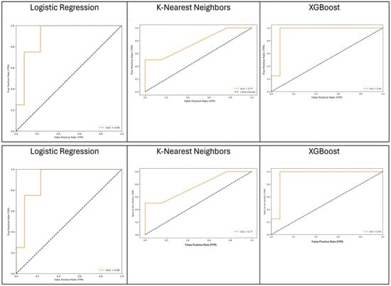 Logistic regression is a supervised learning algorithm used for binary classification tasks. It models the probability that a given input belongs to a particular class using a sigmoid function to map predicted values to probabilities between 0 and 1. XGBoost is a scalable machine learning algorithm that uses an ensemble of decision trees, built sequentially, to improve prediction accuracy by minimizing errors from previous models through gradient boosting techniques. KNN is a simple algorithm that classifies data points based on the majority class of their nearest neighbors in the feature space. Here, “k” represents the number of neighbors to consider. It has the ability to handle missing values by defining default directions for each node in case of missing data. To train and validate the performance of the KNN algorithm, we employed repeated stratified ten-fold cross-validation, repeating the process five times. This method ensured each patient appeared at least once in the testing set, cycling the dataset into ten equally sized folds for training and validation. In our study, we optimized the KNN hyperparameters through a grid search and five-fold cross-validation. The grid search space included parameters such as ‘n_neighbors’ and the distance metric, allowing us to identify systematically the optimal configuration for the KNN algorithm. Feature selection using the coefficients of logistic regression was applied. This involved the identification of the most important features based on their impact on the model’s predictions. In logistic regression, the model assigns a coefficient to each feature, representing how strongly that feature influences the predicted outcome. Features with larger absolute coefficients are considered more important because they have a greater effect on the target variable. By analyzing these coefficients, it is possible to select the most relevant features for the model. The models were evaluated and compared by sensitivity, specificity, and the area under the curve (AUC) of the receiver operating characteristic (ROC) curve. The analyses were performed using Python 3.12.