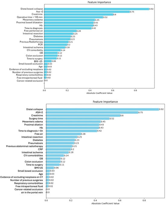 Numerous clinical scoring systems aim at predicting bowel ischemia with the aim of identifying patients with more severe diseases who require emergency surgical intervention or those at high risk of non-operative management failure; however, their validity varies across diverse clinical contexts and geographical regions, thus restricting their generalizability and making bowel obstruction management a significant challenge in clinical practice [8]. Novel approaches typically integrate a combination of clinical and laboratory data or incorporate radiological findings. However, the efficacy and reliability of these integrated scoring systems also warrant further investigation and validation [9,10] The decision-making process regarding the necessity and timing of surgical intervention for BO, as well as the prediction of stoma creation or bowel resection, largely relies on clinicians’ subjective assessments, often characterized as “gut-feeling” judgments. Reliable and objective predictive tools would enhance patient counseling and optimize postoperative care strategies, potentially reducing the variability in patient outcomes [11]. Artificial intelligence (AI) is increasingly used in other fields, such as radiology [12] or clinical trial design [13]. In emergency settings, several applications are being tested where AI-based solutions can assist, e.g., in triaging patients or in predicting disease progression [14], but little research has been conducted on its implementation in bowel obstruction. The present study aims to analyze the role of machine learning algorithms in bowel obstruction and their ability to predict postoperative complications.