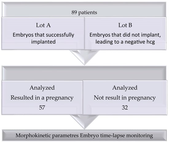 A total of 89 patients were enrolled in this study and were divided into two groups: Lot A included 57 patients who had embryos that implanted successfully, resulting in live births, and Lot B included 32 patients whose embryos did not implant, leading to a negative HCG. The difference between the two analyzed groups underlines the potential impact of morphokinetic characteristics on implantation success. The flowchart of the included patients is related in Figure 1.