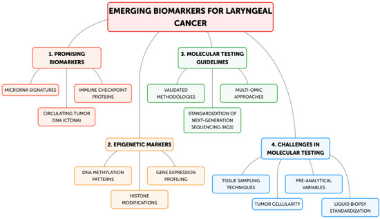 Although there is a lot of potential in the integration of molecular data into the clinical therapy of laryngeal cancer, there are still several issues that need to be resolved. Researchers and physicians must overcome these challenges as the area develops while investigating novel technology and methods to enhance patient outcomes. The present obstacles, new developments, and potential applications of personalized medicine in laryngeal cancer are covered in this section. A major obstacle in the application of molecular testing for laryngeal cancer is the absence of uniformity among various laboratories and establishments. This unpredictability may ultimately impede the general adoption of molecular-based techniques in clinical practice by producing inconsistent results and making it difficult to compare data across investigations. Several professional associations have started creating standards for molecular testing in head and neck cancers, including laryngeal carcinoma, to solve this problem. For instance, guidelines for HPV testing in head and neck carcinomas have been jointly published by the American Society of Clinical Oncology (ASCO) and the College of American Pathologists (CAP) [142]. For testing procedures and other molecular markers, comparable standardized techniques are required. Several important areas should be the focus of efforts to standardize molecular testing. It is imperative to establish standard operating procedures for tissue collection, preservation, and processing to guarantee reliable and superior-quality samples for molecular analysis. Inter-laboratory variability can be decreased by standardizing the methods used for molecular testing, such as next-generation sequencing, in situ hybridization, and immunohistochemistry. Consensus criteria for the interpretation and reporting of molecular test results should be developed to promote uniformity and ease clinical decision-making. Maintaining high standards across laboratories can be facilitated by putting in place strict quality control procedures and frequent proficiency testing programs. Our knowledge of the molecular landscape of laryngeal cancer can be enhanced, and research collaborations facilitated by the establishment of centralized databases for molecular data [143]. Academic institutions, professional associations, and regulatory bodies must work together to address these standardization difficulties. To expedite progress in this area, multinational consortia and working groups devoted to standardizing molecular testing in laryngeal cancer might be formed. Technological developments in molecular profiling are contributing to our ongoing capacity to better understand the proteomic, transcriptomic, and genomic landscapes of laryngeal cancer. Better prognostic and predictive biomarkers may result from the more thorough and accurate molecular characterization that these developing technologies provide. Through the examination of individual cells within a tumor, single-cell sequencing can reveal intratumoral heterogeneity and identify uncommon cell types like cancer stem cells. Head and neck malignancies have already been treated with single-cell RNA sequencing, which has identified unique molecular subgroups and possible treatment targets [92]. Gene expression analysis and spatial data are combined in spatial transcriptomics, enabling researchers to map the distribution of various cell types and genetic markers inside the tumor microenvironment. Regarding immune cell infiltration patterns and tumor–stroma interactions in laryngeal cancer, this technology may offer important new insights [144]. Liquid biopsies provide a minimally invasive way to evaluate therapy response and perform molecular profiling by analyzing circulating tumor DNA (ctDNA) and circulating tumor cells (CTCs) in blood samples. Liquid biopsies have shown promise in recent times for early identification, prognostication, and therapy response monitoring in head and neck cancers, including laryngeal carcinoma [145]. A more thorough examination of the protein and metabolite profiles in laryngeal cancer is now possible thanks to sophisticated mass spectrometry techniques. The identification of novel biomarkers and therapeutic targets may result from these proteomics and metabolomics techniques [146]. Prognostic models and treatment decision support systems may be enhanced by the combination of clinical data, molecular data, and machine learning techniques. These tools have demonstrated promise in the analysis of intricate datasets, revealing patterns that conventional statistical techniques would miss [147]. The thorough validation and standardization of these technologies will be necessary for their inclusion into clinical practice as they continue to evolve. Additionally, to help doctors translate molecular results into practical treatment recommendations, the interpretation of complicated molecular data will require the creation of user-friendly tools and decision support systems. Ultimately, molecular profiling in laryngeal cancer aims to provide genuinely customized treatment plans that optimize effectiveness while reducing side effects. There are several exciting new directions in targeted medicines and customized medicine. Research on optimizing immunotherapy is ongoing because immune checkpoint inhibitors have been demonstrated to be effective in certain laryngeal cancer patients, although response rates are still not at their best. In order to improve the outcomes of immunotherapy, research is still being conducted to uncover predictive biomarkers and combination tactics. For example, immune checkpoint inhibitors can be used in conjunction with targeted medicines or radiation therapy to boost anti-tumor immune responses [43]. The growing understanding of the molecular causes of laryngeal cancer is opening up new avenues for the development of sensible medication combinations. For example, preclinical research and early-phase clinica