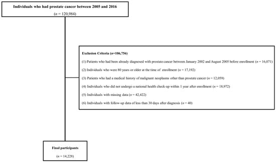 Figure 1 shows the flowchart of participants according to the inclusion and exclusion criteria. This cohort included patients with a prostate cancer diagnosis between 2002 and 2021. To enroll patients newly diagnosed with prostate cancer and rule out false positives for prostate cancer, those diagnosed before September 2005 when the special code system began were excluded from the study. Initially, 120,984 individuals diagnosed with prostate cancer between 2005 and 2016 were included in the study. The following exclusion criteria were applied: (1) patients who had been already diagnosed with prostate cancer between January 2002 and August 2005 before enrollment (n = 16,071); (2) individuals aged ≥ 80 years at the time of enrollment (n = 17,192); (3) patients with a history of malignant neoplasms other than prostate cancer (n = 12,059); (4) individuals who did not undergo a national health check-up within one year of being newly diagnosed with prostate cancer (n = 18,972); (5) individuals with missing data (n = 42,422); and (6) individuals with follow-up data of less than 30 days after diagnosis (n = 40). In total, 14,228 men were included in the final analysis.