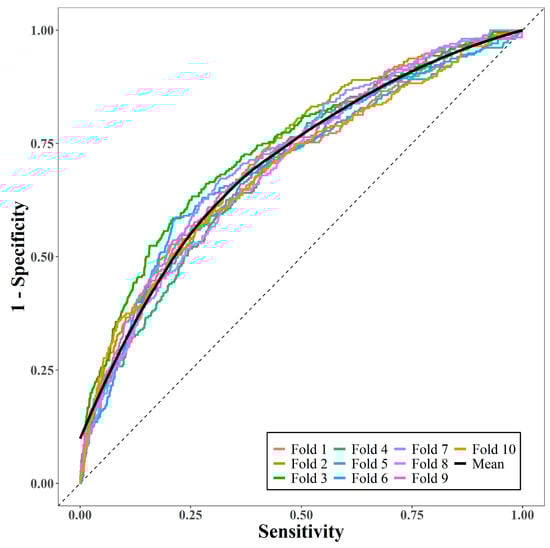 The performance of the prediction model was measured via 10-fold cross-validation. Figure 2 displays the 10 receiver operating characteristic curves and the mean curve. The mean AUC was 0.71, suggesting that the model had moderately good predictive performance.